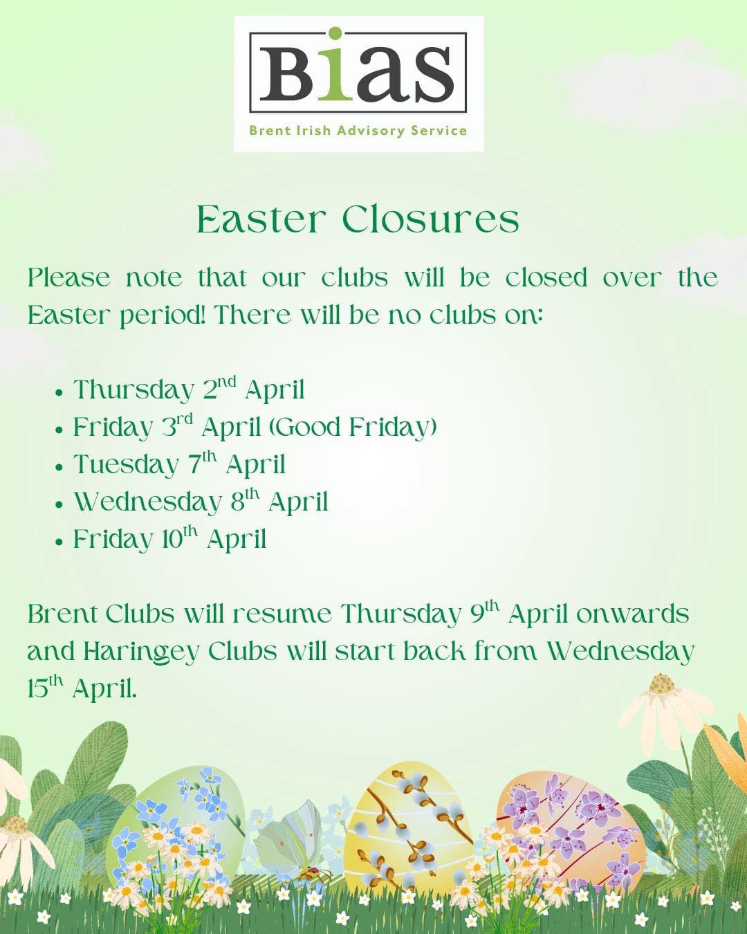 - Brent clubs will be closed from Thursday 2nd April to Tuesday 7th April